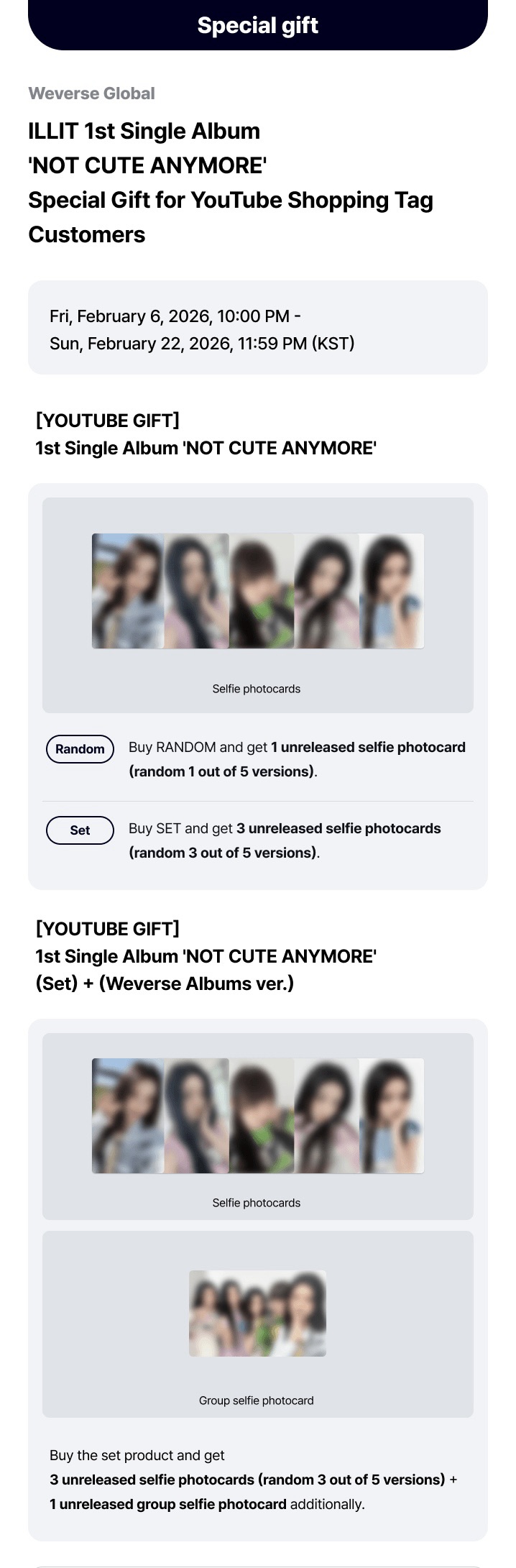 только при покупке сета ( not cute Ver. и not my name Ver. )+ weverse Ver. - фотокарта ( 3 из 5 ), групповая фотокарта.